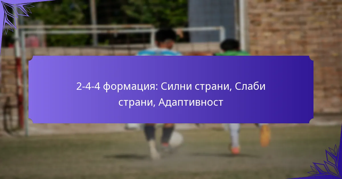 Формацията 2-4-4 може да бъде адаптирана чрез тактически корекции, основани на силните страни на противниците, модифициране на стратегиите за различни сценарии на мача, променяне на ролите на играчите в зависимост от динамиката на играта и интегриране с други формации по време на игра. Тези адаптации подобряват както атакуващите, така и защитните способности, позволявайки на отборите да реагират ефективно на различни предизвикателства на терена.